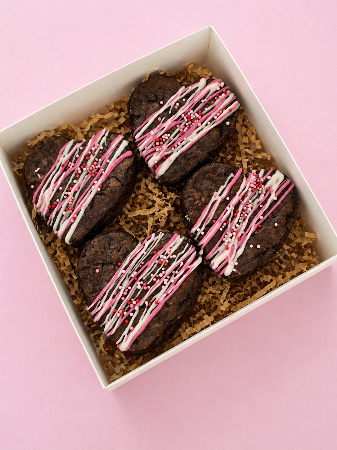 Four of the most decadent gooey choccy brownies, shaped as hearts for your loved one!