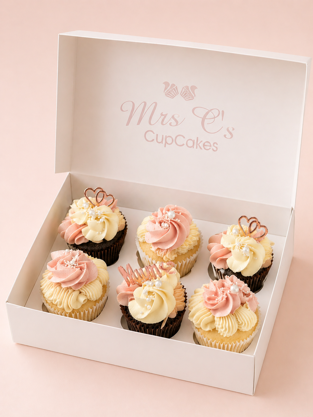 Six of Mrs C's Cupcakes signature cupcakes. Half vanilla, half chocolate and really moist and fluffy. Perfectly piped vanilla buttercream, comes with pearls and mini cake toppers!